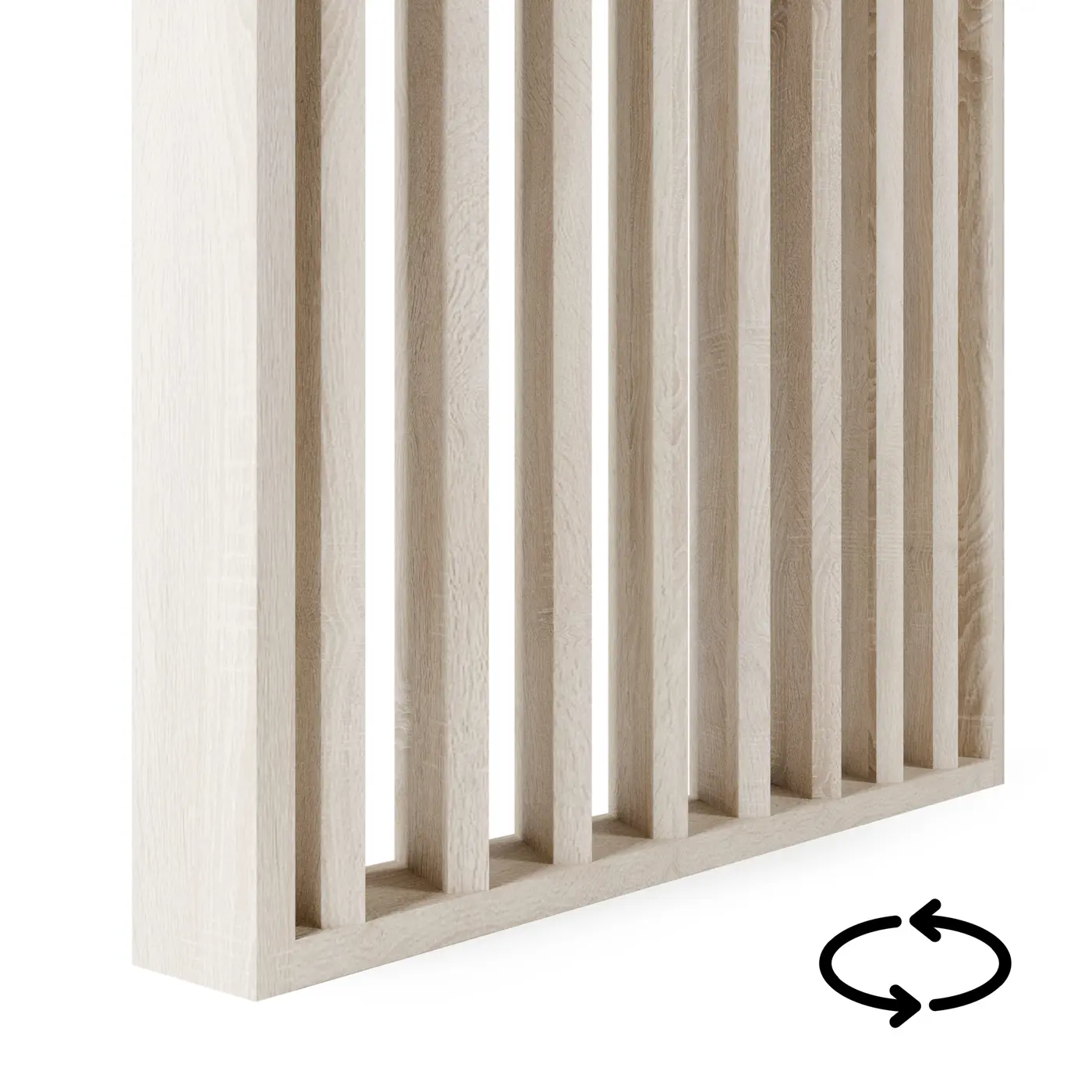 Ścianka działowa z lamelami obrotowymi 22×90 mm w odcieniu dąb sonoma to nowoczesny i funkcjonalny element, który doskonale podkreśli charakter Twojego wnętrza. Wykonana z wysokiej jakości MDF o dużej gęstości, prezentuje się wyjątkowo dzięki eleganckiemu wykończeniu w kolorze dąb sonoma. Lamele, oklejone folią nałożoną na wszystkich czterech stronach, tworzą efekt bezszwowych krawędzi, nadając całości spójny i estetyczny wygląd. Mechanizm obrotowy umożliwia łatwą regulację przepływu światła oraz poziomu prywatności – wystarczy obrócić lamele, aby całkowicie zamknąć przestrzeń lub umożliwić wpuszczenie światła i powietrza.